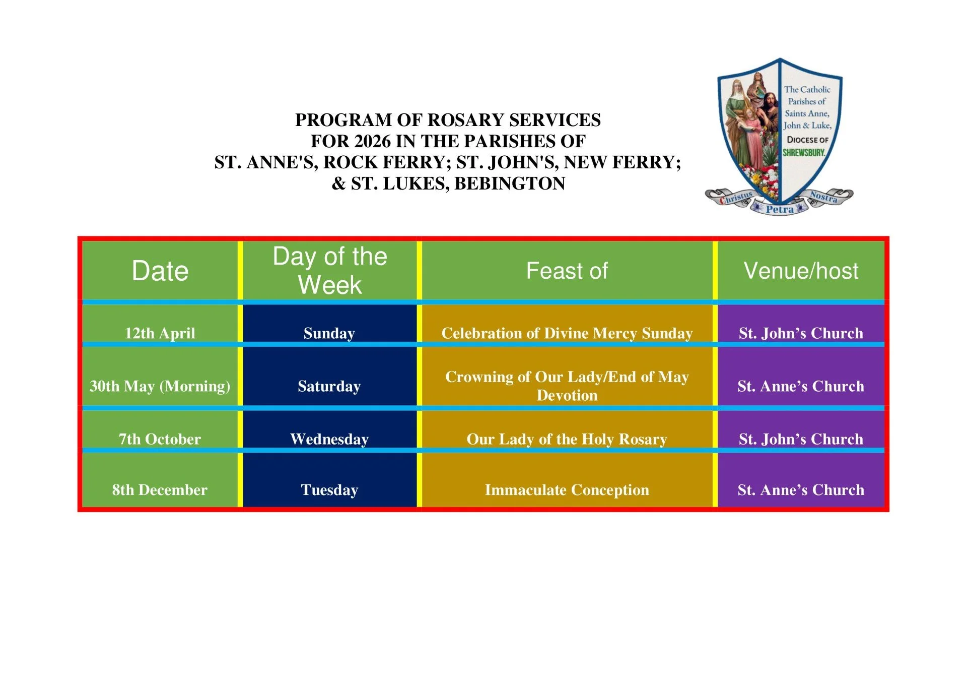 On Friday 5th July we will be having a thanksgiving mass for Father Mario on his 10th year anniversary as an ordained priest. A warm welcome is extended to our three parishes; St Anne’s, St John’s and St Luke’s. Mass will be at 7pm followed by coffee and cake in the presbytery.